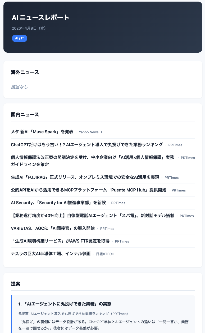 毎朝、AIがその日の記事を読んで、カテゴリごとに整理する。AI・DX・エネルギー・製造業・スタートアップなど、自社の事業に関連するジャンルに分けて、それぞれ「この記事をうちの事業にどう活かせるか」まで提案してくれる。