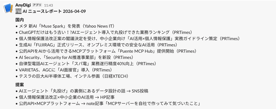 毎朝Slackを開くと、AIが3本のレポートを届けている