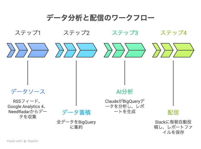 Google Analytics 4のデータをBigQueryに流し、AIが前日分を自動で分析する。ユーザー数、どのページが読まれたか、どの地域から来たか、流入元は何か。